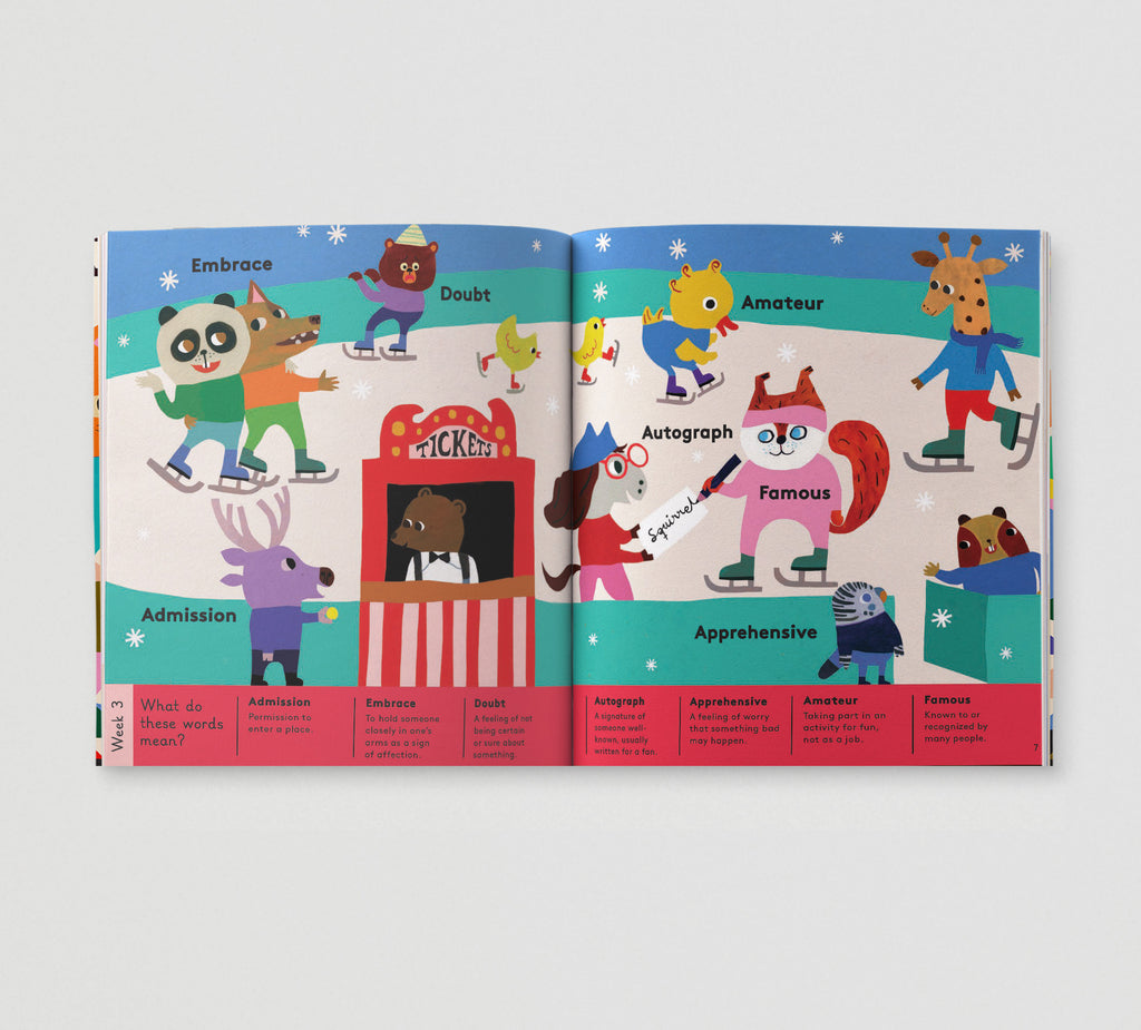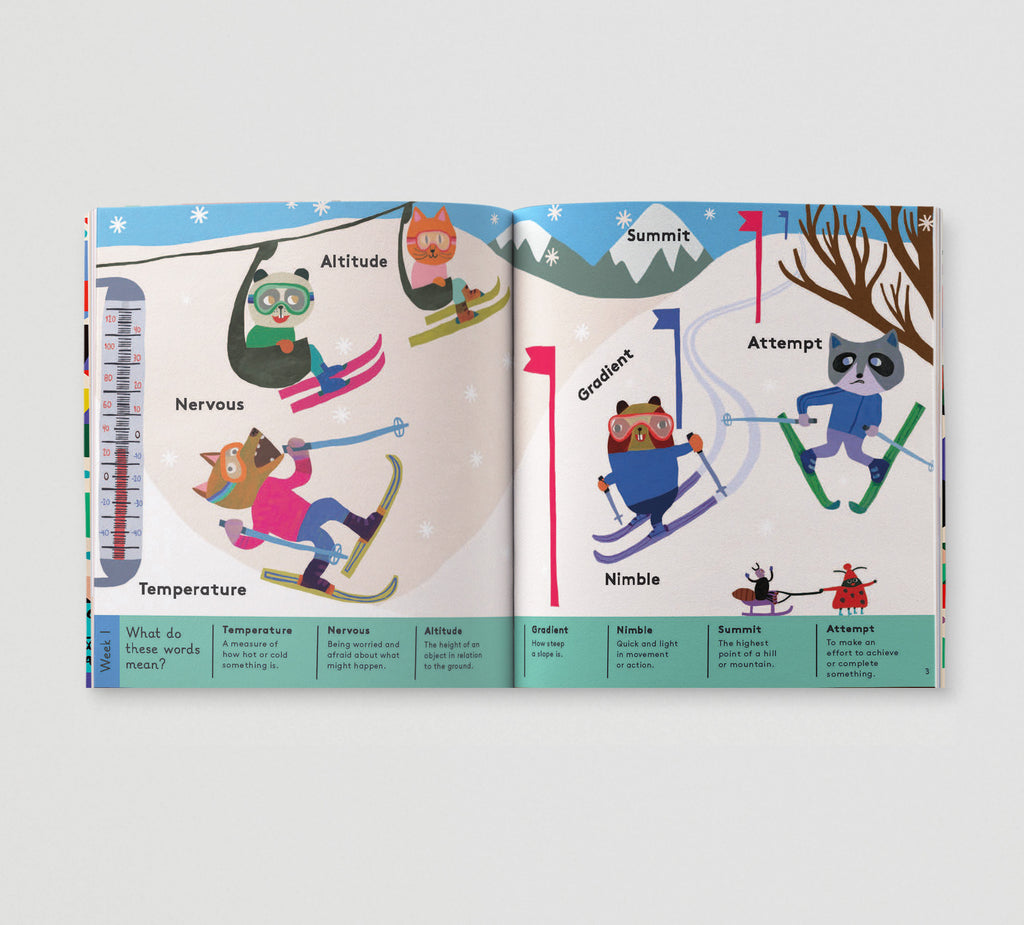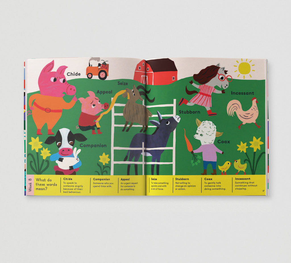 Each fully illustrated scene provides a fun and supportive platform to introduce little readers to big words and extend their vocabulary, which studies have recently proven to be the biggest indicator of a child's potential later in life. Curated by a literacy expert, these 365 aspirational words will fire your child's imagination, help them; label their emotions and expand their comprehension. Each word is explained beneath in simple language to aid understanding and inspire a love of language.
